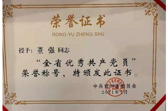 百年征程波澜壮阔,百年初心历久弥坚。2021年7月2日上午10时,贵州省庆祝中国共产党成立100周年大会在遵义召开。会上,对全省优秀共产党员、优秀党务工作者和全省先进基层党组织进行了表彰,公司董强教授获“全省优秀共产党员”荣誉称号。