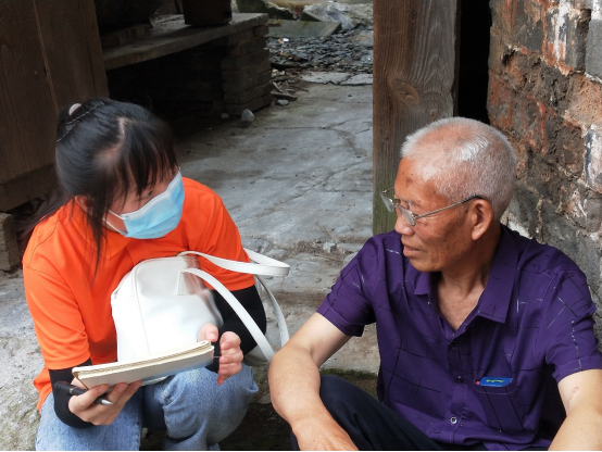 图为实践团向村民宣传“禁毒”“防艾”实践内容,村民认真的阅读调查问卷内容