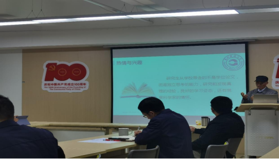 本次周会由杨昌儒教授作题为“研究生成长之我见”的讲座。杨昌儒教授从多年来培养员工的经验出发,总结出研究生的成长,包含三个方面:一、研究生之定位;二、学问之道;三、成功之秘决。最后是师生互动环节。
