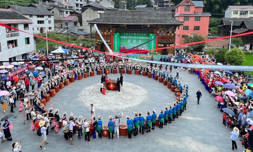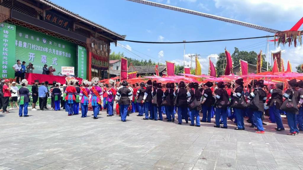 开幕式在村里的广场举行,每个村组建队伍参加,由该村的一名男士举写有自己村名的旗帜入场,女士都着自己民族的盛装,红黄蓝绿不尽相同,各有特色,每个村队伍的最前面都有一位姑娘举着写有村名的牌子作为领队。除彦洞乡各村寨参与外,还有来自剑河,贵阳等的队伍来参加。在队伍巡游结束回到广场后还进行了扁桶围塘表演,即在广场中央放扁桶数只,在上面摆放腌鱼、水果、蔬菜等,各村代表围坐在扁桶前,随后寨老领着一小孩进入扁桶圈中的大木桶前,一边用侗语念词,一边咀嚼木桶上的大葱,后离场。最后在主持人的一声声致辞中黄门村2024年吃新节拉开了帷幕。