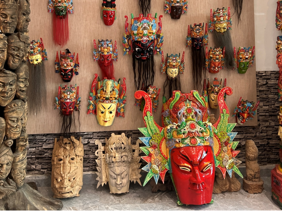 我们循着声音走进村落,在一处院落前撞见了正在雕刻非洲面具的于顺平师傅。于师傅今年45岁,14岁随兄长学艺,后赴北京进修现代雕刻技法。其工作室同时陈列着传统地戏面具与非洲面具,这种跨文化的创作尝试,反映了年轻一代艺人对市场需求的敏锐回应。“现在主要通过网店销售,老客户占比达较大,”于师傅介绍道。