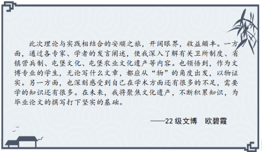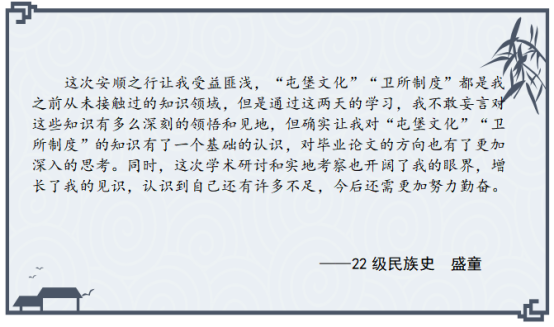 此次安顺屯堡文化学术研讨会是公司开展“学与思”系列研学活动的重要尝试,参会的硕士研究生在理论学习与实地考察中受益匪浅,感悟颇多,激发了他们对卫所制度的兴趣,有助于提升专业素养,扩大学术视野,促进论文选题。以下是参会硕士研究生的思考摘录。