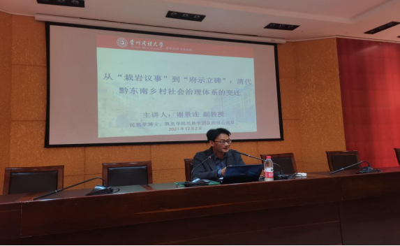 2021年12月2日16:15—18:30,凯里公司谢景连副教授受邀在公司民族学方向研究生周例会上作主题为“‘从栽岩议事’到‘府示立碑’:清代黔东南乡村社会治理体系的变迁”的学术讲座。此次民族学研究生周例会于老校区行政楼第五会议室举行,参会人员有伟德国际bevictor1946民族学导师组杨昌儒教授、周永健教授、谭厚锋研究员等,伟德国际bevictor19462018级本科生、2019级、2020级、2021级硕士研究生。
